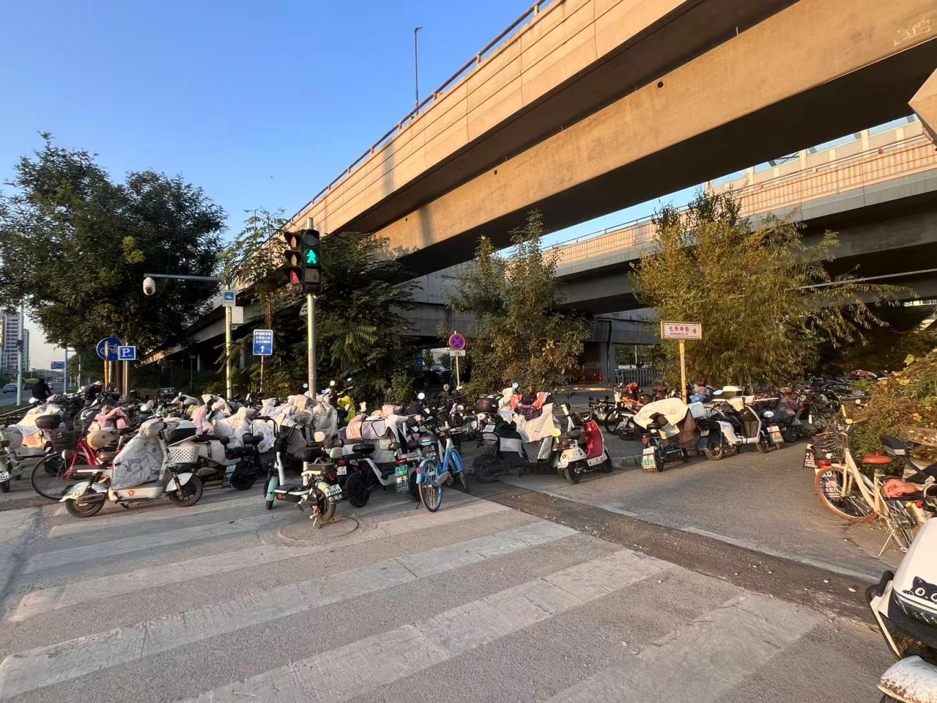 10月13日笔者乘昌平线抵达朱辛庄地铁站A2口,走出站口便见路口交通十分混乱。道路两侧及转角处停满电动车、自行车及共享单车,七辛中街的狭窄路口更是“车满为患”——车辆紧贴路边停放,仅留不足1.5米的间隙,过往非机动车需减速慢行,还要避让行人,危险重重。